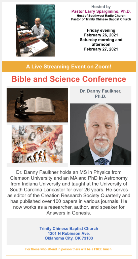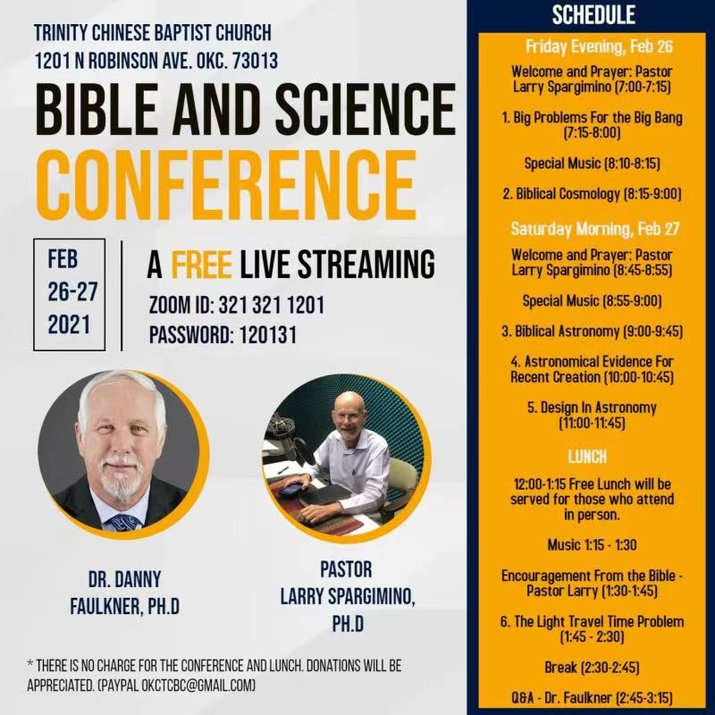 三一华语浸信会,將于2021 年2月26-27日,周五,周六,举办「 圣经与科学講座」,由本会Larry Spargimino 牧師 邀請 Dr. Danny Faulkner PH.D 主講,從神所啟示的圣经,來看现代科学与天文学之间的関連…等,欢迎您与我们,一起來發现,其中的智彗和奧祕。