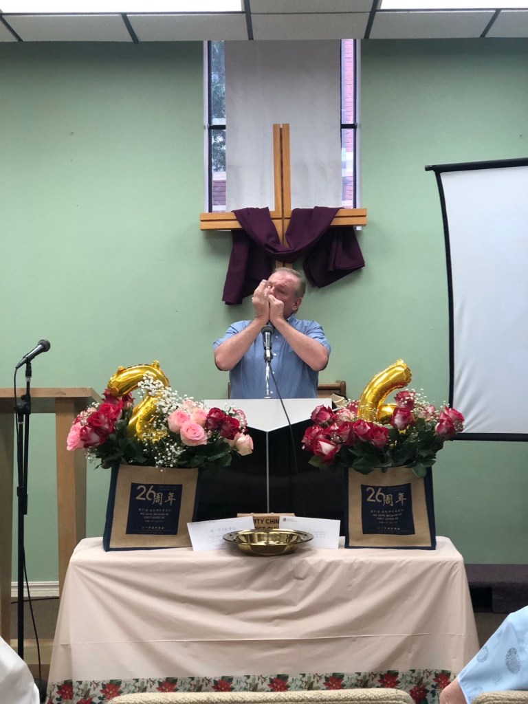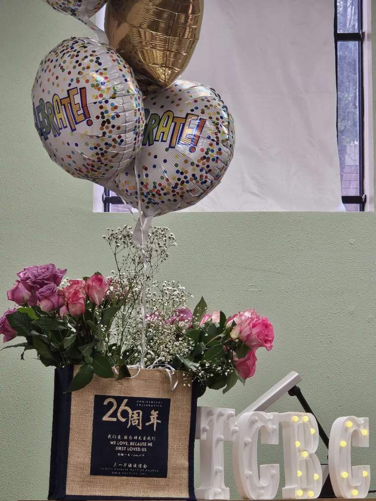 时光荏苒!26 年来,小小的三一教会坚持引领更多的人归向独一真神–主耶稣基督。一年又一年,一批又一批的人在这里接受神,让神成为他们生命的主宰,又从这里走向世界和全美各地,继续传扬主耶稣基督的美名。在 26 周年庆典之际,神的儿女从中国大陆、台湾、纽约、加州、德州等地送来了他们的祝福和奉献,帮助教会超额完成了此次建堂基金的募集目标。神的慈爱和大能也激发着教会各肢体分工协作,准备并完成了 6 月 16 日的 26 周年庆典。有的同工早早设计订购了 26 周年纪念袋、有的制作视频、有的订购蛋糕、有的购买鲜花并布置会场、有的安排爱宴。庆典简单但敬虔且温馨动人,90 岁高龄的毛牧师和师母亲临现场并带来贺信,美南三一华语浸信会也寄来贺信,众弟兄姐妹献上精心准备了几个月的赞美诗《亲眼看见你》,Fiona 姐妹为主做见证,讲述了自己从 26 年前走到今天,一路收获家庭和事业的经历。Larry 牧师也分享了自己从初识三一教会到如今三一教会成为他生命中非常重要的一部分的美好历程。美妙的音乐、美好的见证、美丽的鲜花、